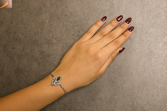 .925 Sterling Silver Marquise Black Onyx, Orange Citrine, and Diamond Accent Lariat 4”-10” Fleur De Lis Adjustable Bolo Bracelet (I-J Color, I1-I2 Clarity) - 7"