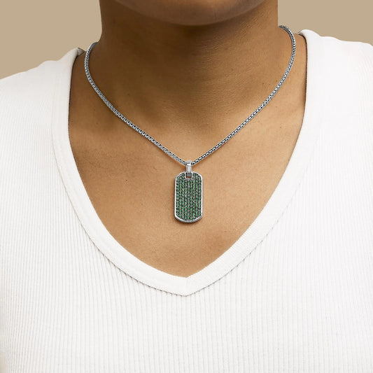 Men's .925 Sterling Silver Created Green Emerald Dog Tag Pendant Necklace - 22" Inches