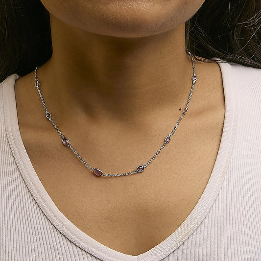 .925 Sterling Silver Checkerboard Cut Purple Amethyst Bezel Station Necklace - 22" Inches