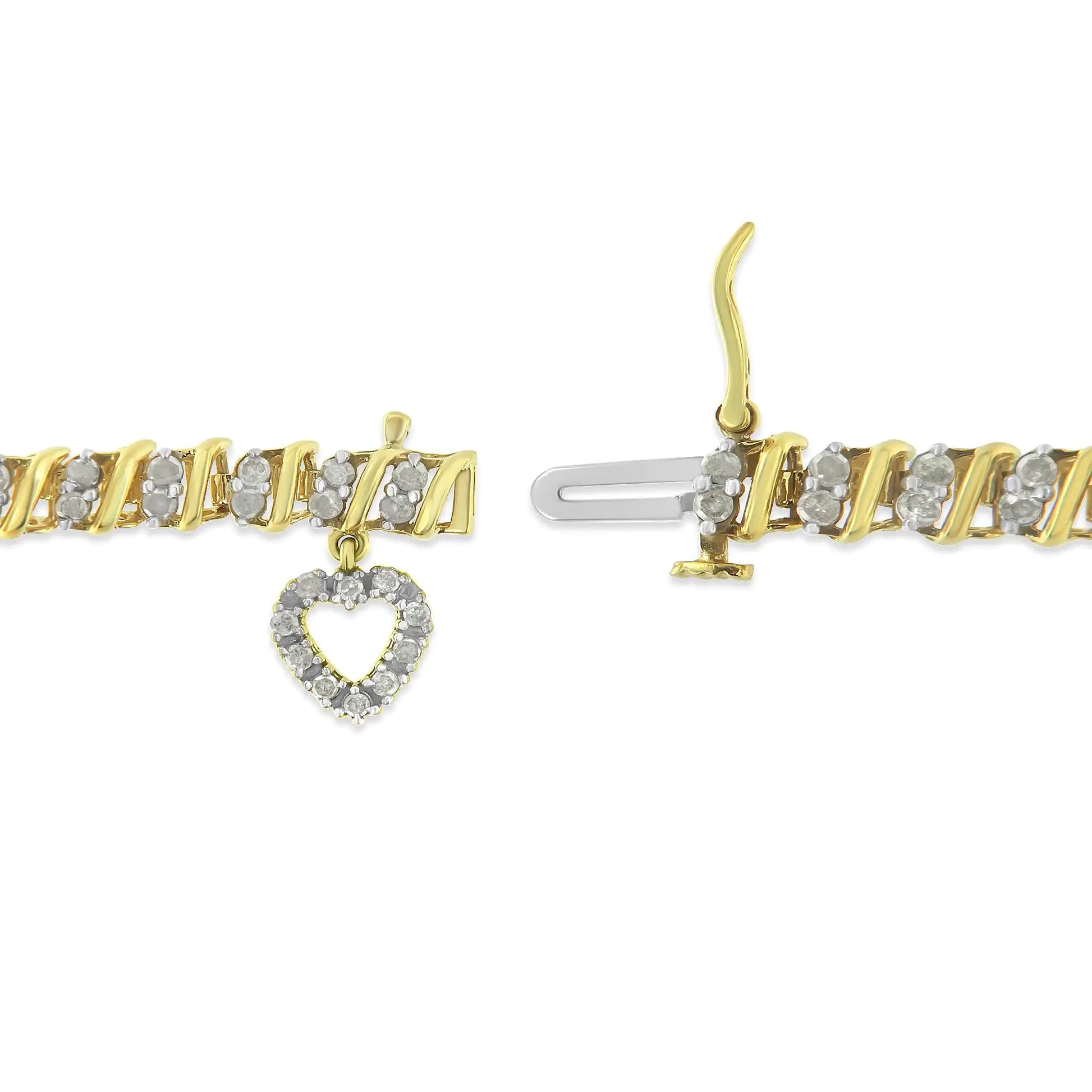10K Yellow Gold over .925 Sterling Silver 2.0 Cttw Diamond Heart Charm 7" Link Bracelet (I-J Color, I3 Clarity)