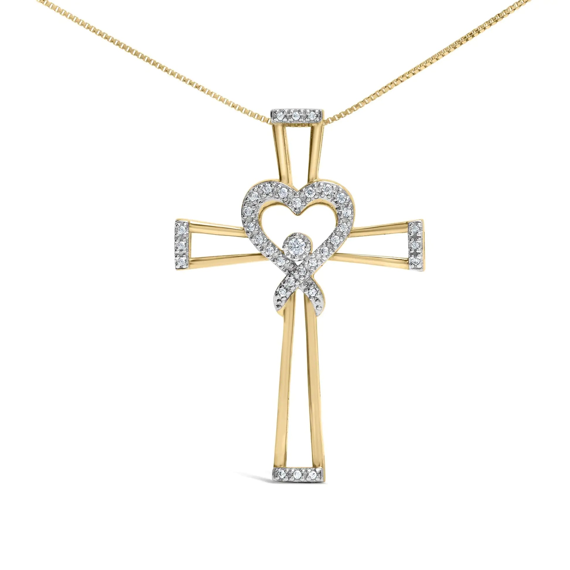 14K Yellow Gold Plated .925 Sterling Silver 1/6 Cttw Diamond Interlocking Heart and Ribbon Cross Pendant Necklace (H-I Color, I2-I3 Clarity) - 18" Inches