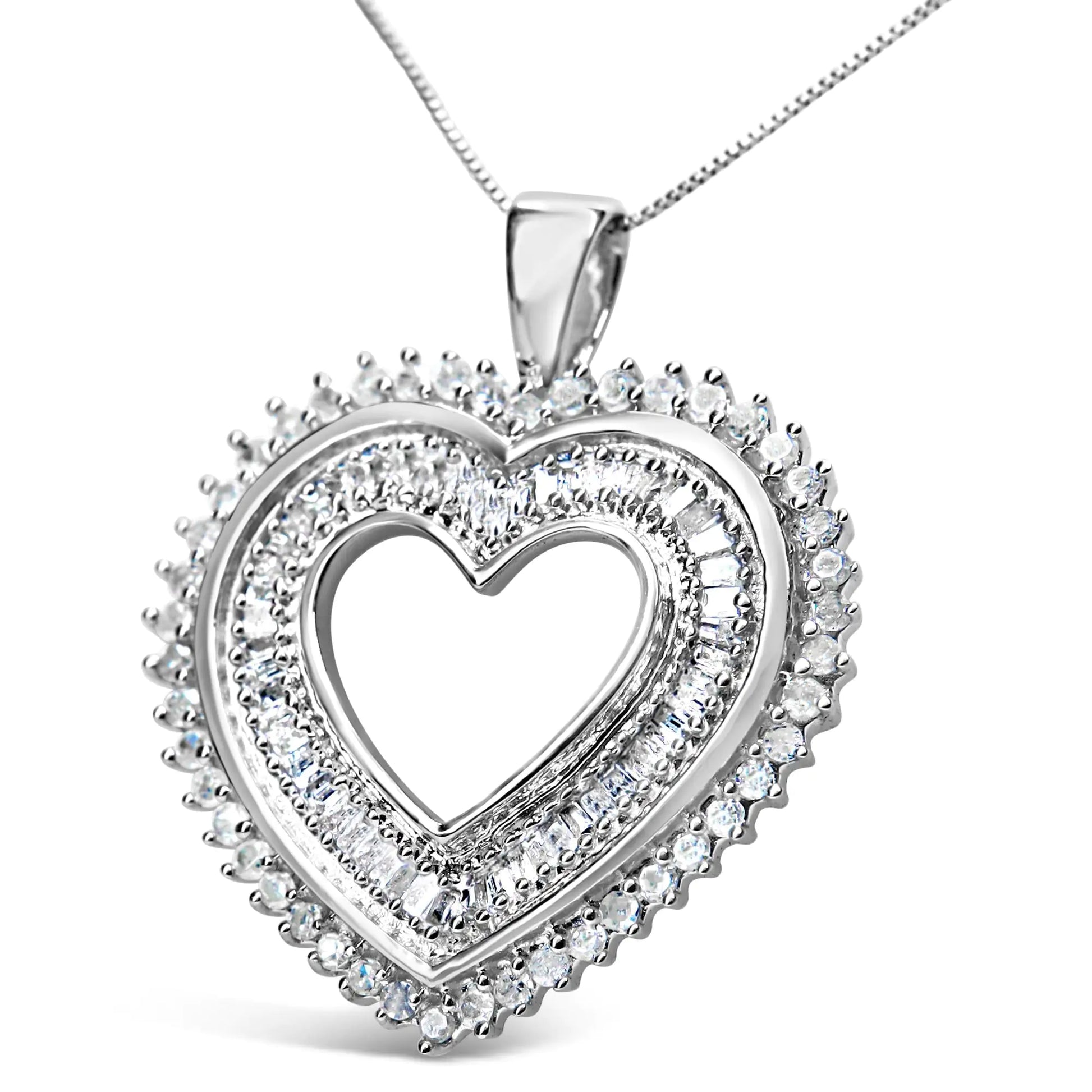 .925 Sterling Silver 1.0 Cttw Baguette and Round Diamond Heart Pendant 18" Necklace (H-I Color, I3 Clarity)
