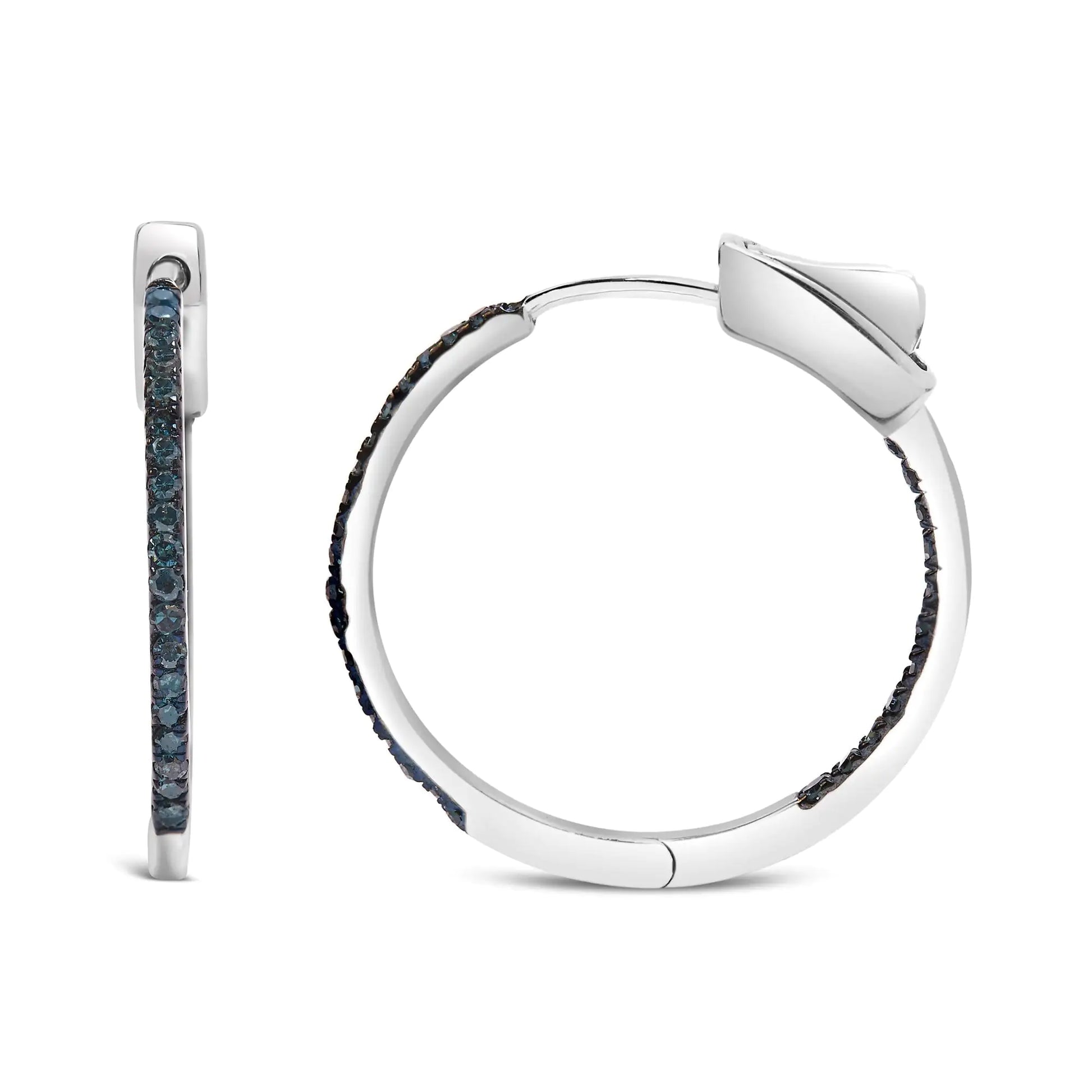 .925 Sterling Silver 1/3 Cttw Inside Out Blue Treated Diamond 1MM Wide Hoop Earrings (Blue Color, I2-I3 Clarity)
