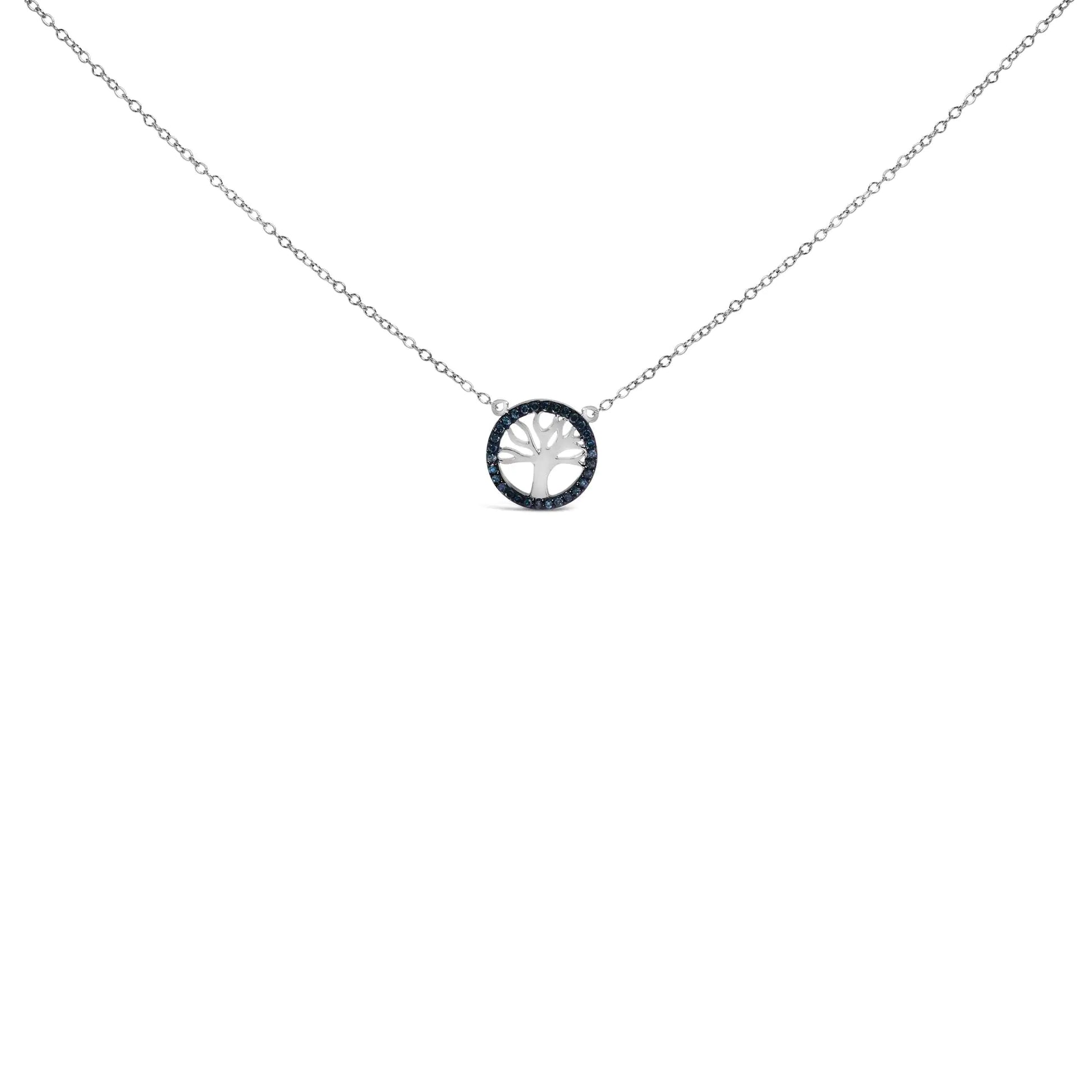.925 Sterling Silver 1/6 Cttw Blue Diamond Tree of Life and Circle 18" Pendant Necklace (Blue Color, SI1-SI2 Clarity)