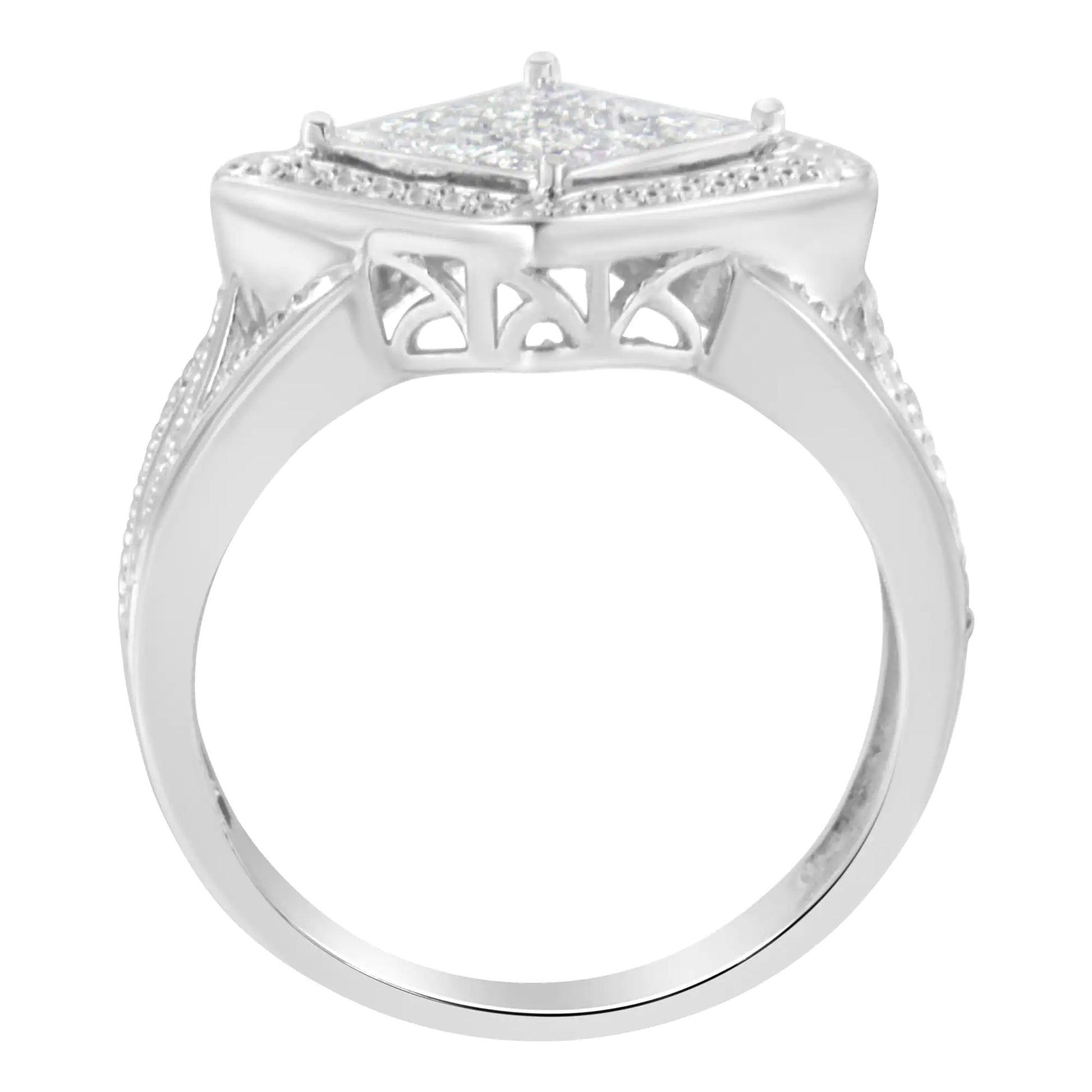 This cluster sits inside a rounded milgrain-edged border 🌟, supported by a tri-split shank 🔲 also detailed with silver beading ✨. The ring has a tapered band 📏 and a decorative openwork cutout gallery 🔲.