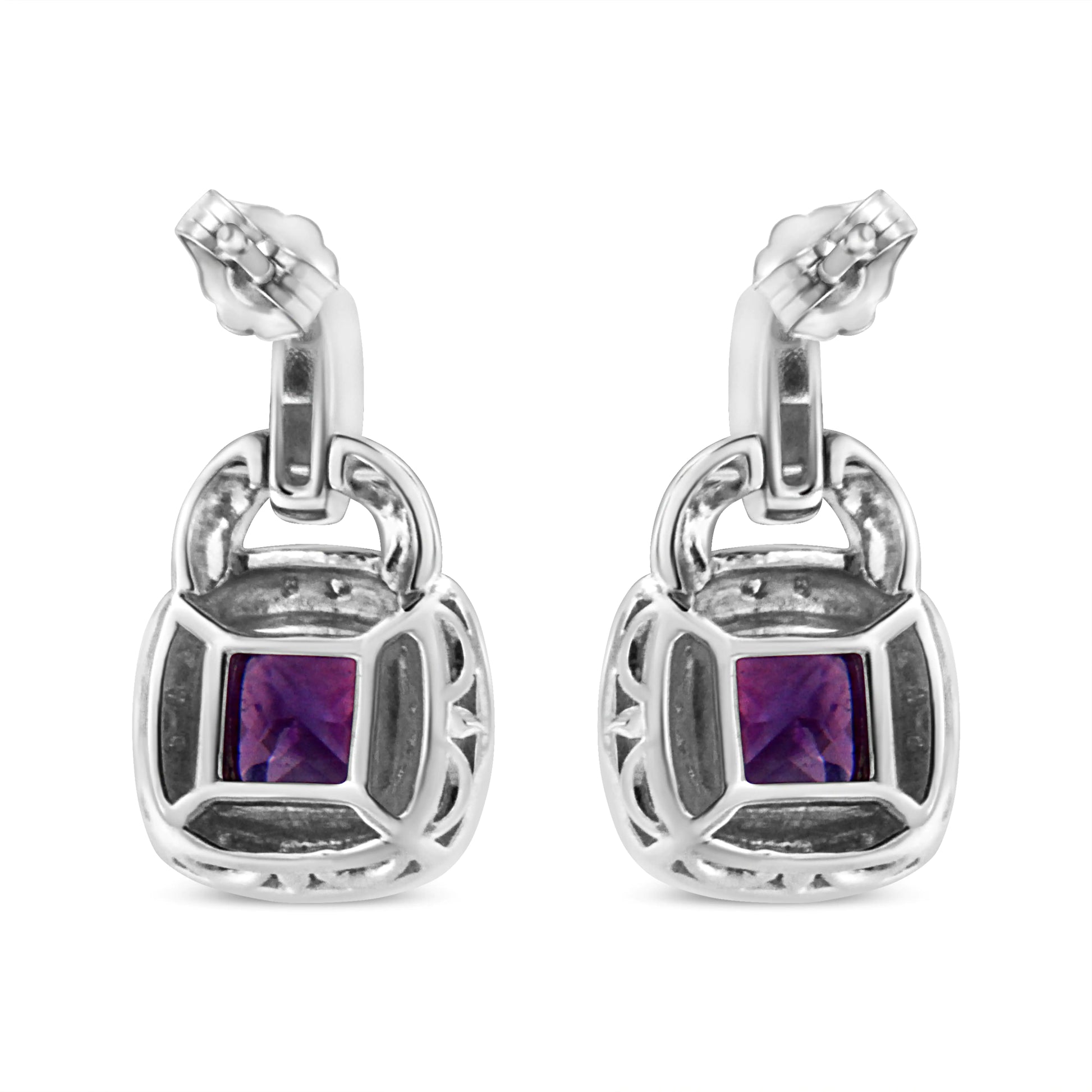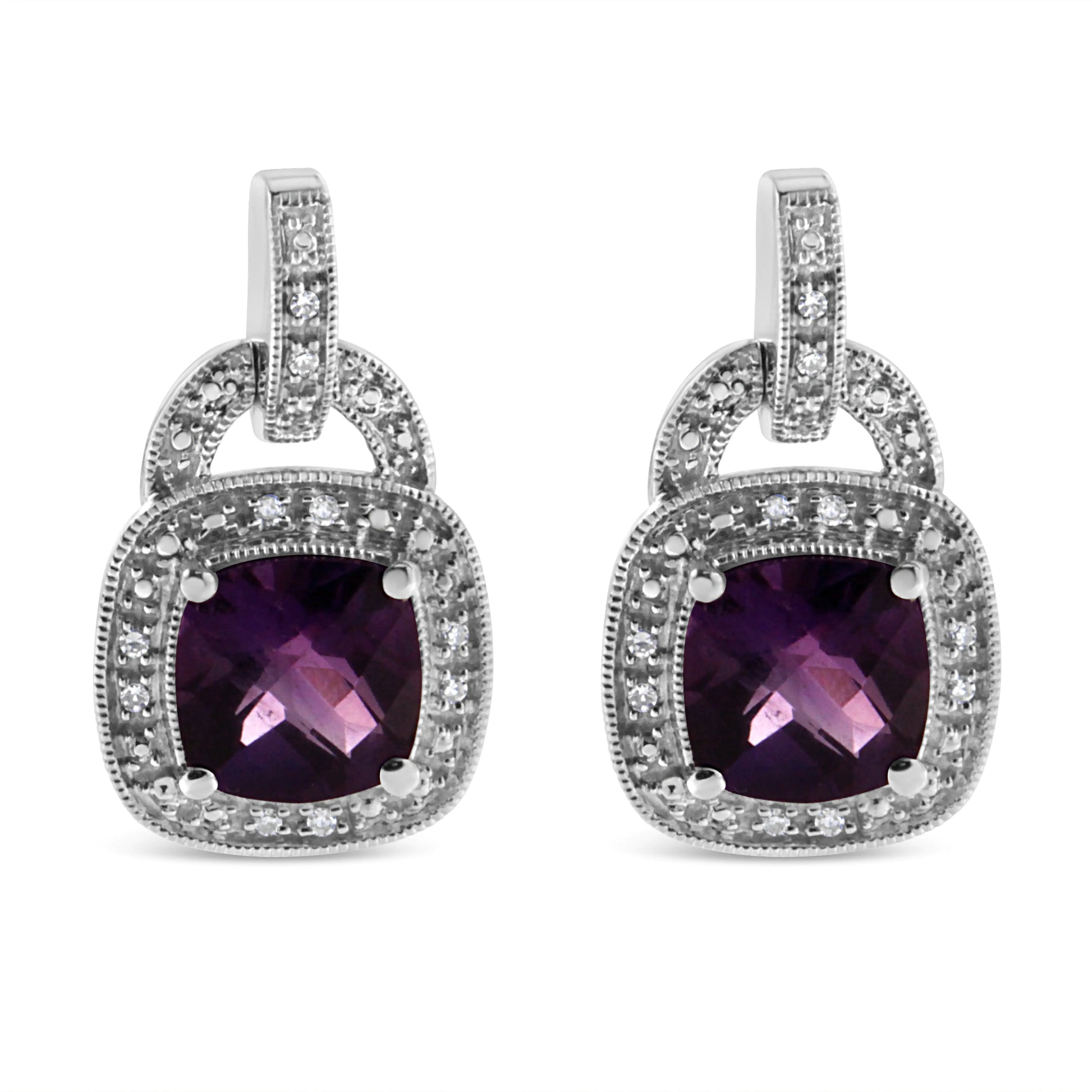 .925 Sterling Silver 8MM Natural Cushion Shaped Amethyst and Diamond Accent Halo with Push Back Dangle Earrings (I-J Color, I2-I3 Clarity)