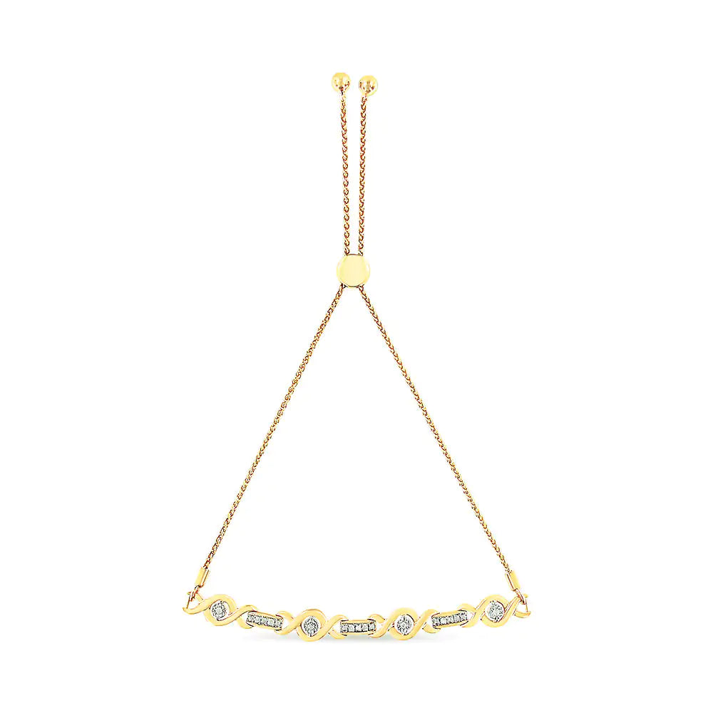 Designed to elevate any ensemble, this stylish diamond bolo bracelet is crafted from 14k yellow gold plated .925 sterling silver 💎. It features infinity links that encircle alternating round and rectangular diamond-embellished clusters. Each diamond is set to perfection, offering a sparkling elegance that's sure to captivate ✨.