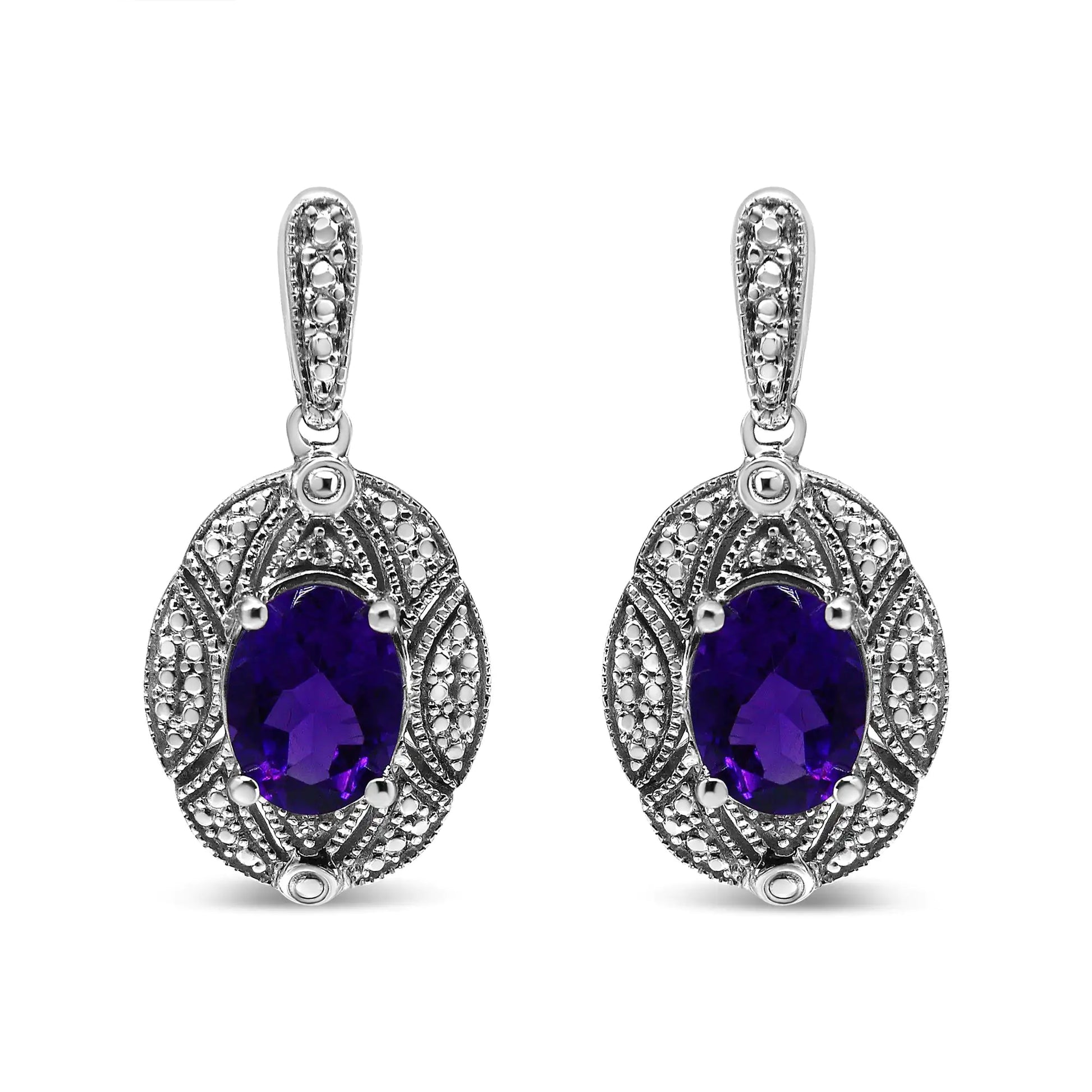 💎 Set in .925 sterling silver, the earrings feature an 8x6mm oval-cut amethyst gemstone in purple, glowing beautifully against a halo of intricate milgrain detailing and round-cut white accent diamonds. 🌟