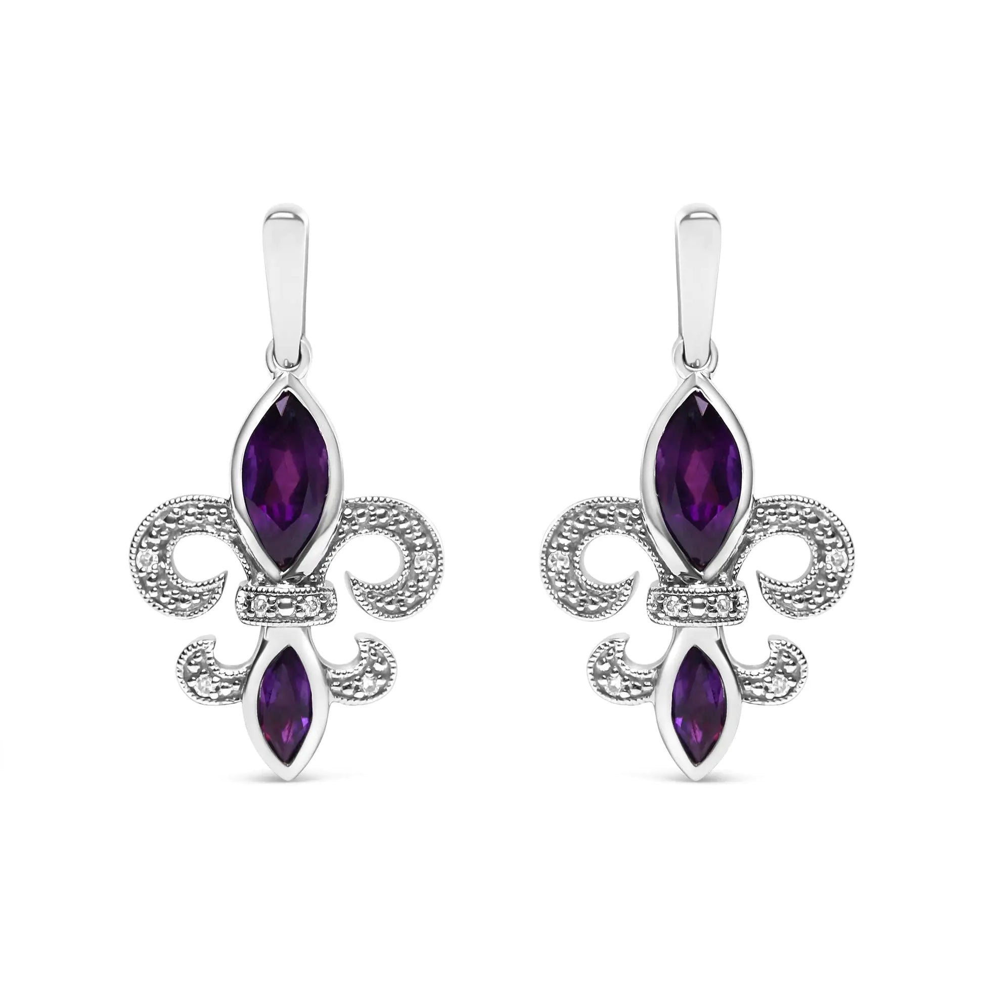 .925 Sterling Silver Marquise Cut Amethyst and Diamond Accent Fleur De Lis Dangle Stud Earrings (H-I Color, SI1-SI2 Clarity)
