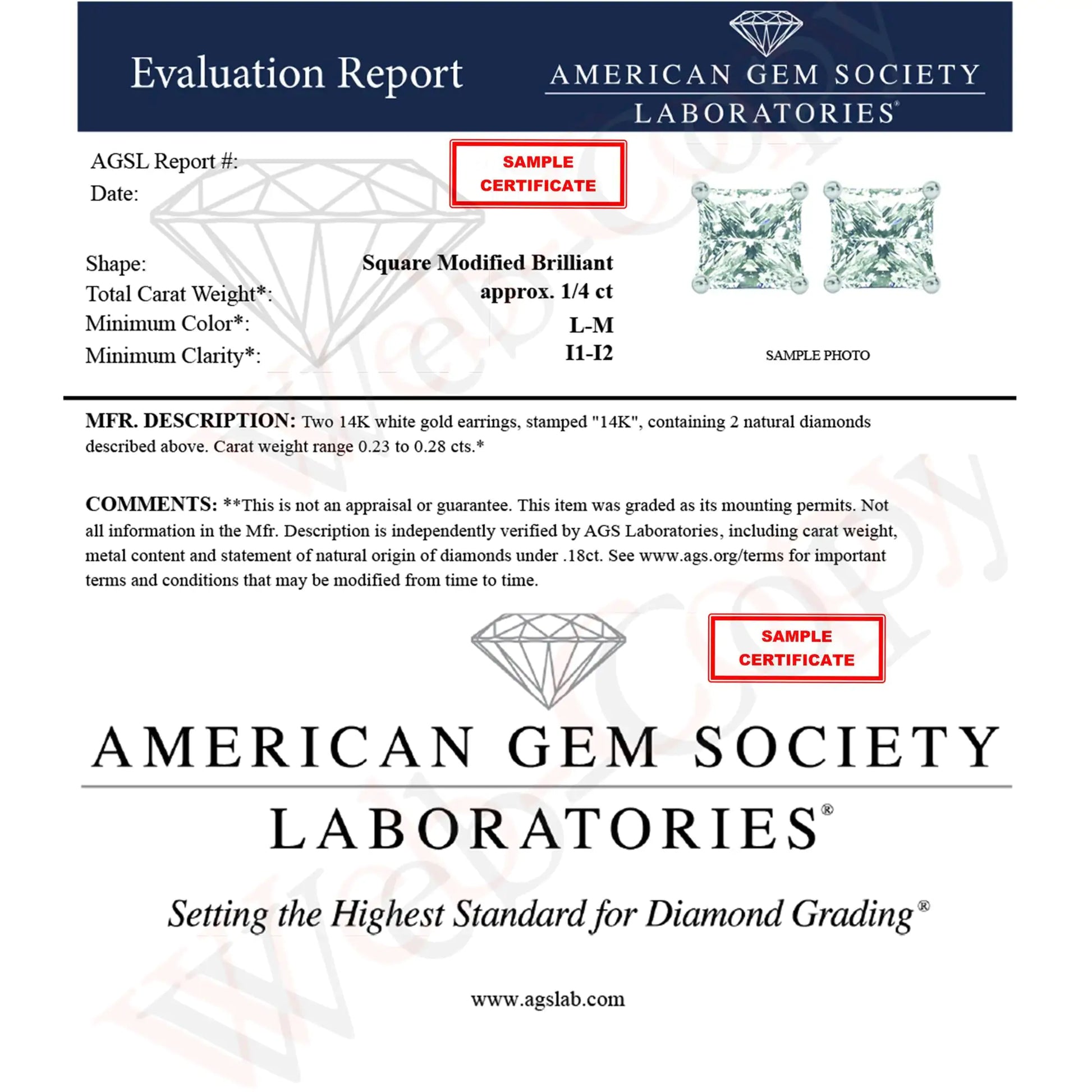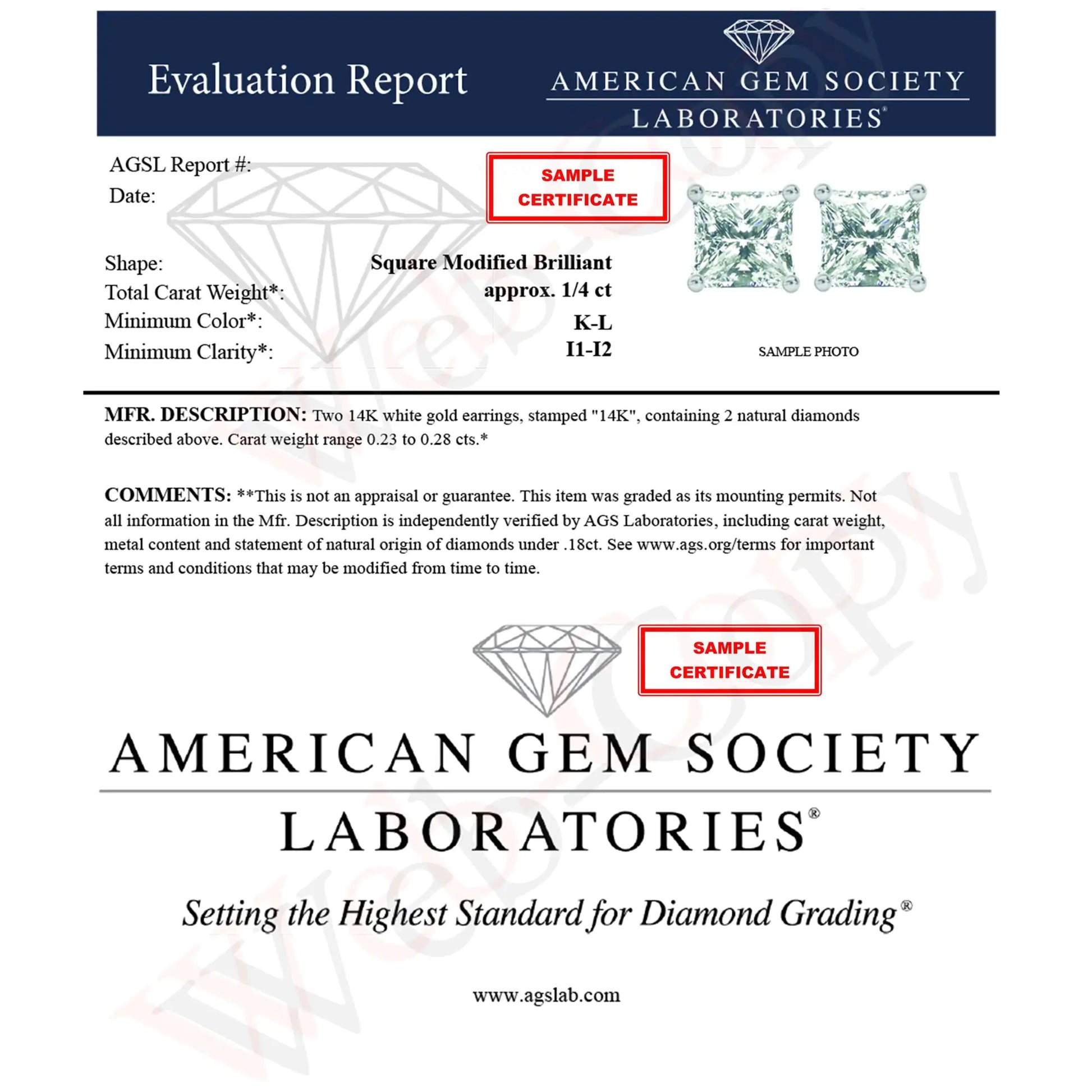 AGS Certified Princess Cut Diamond 14K Gold 4-Prong Solitaire Square Stud Earrings (L-M Color, I1-I2 Clarity)